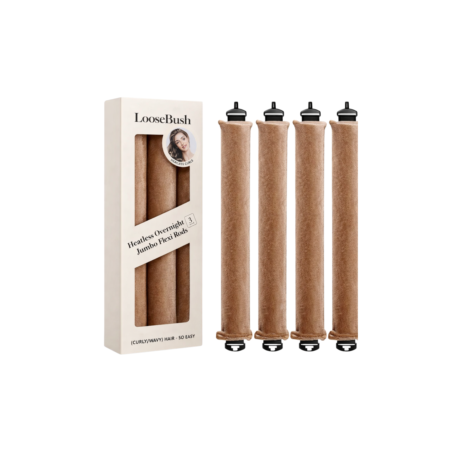 LooseBush Heatless Curls Overnight Set is a hairstyling tool that lets you achieve curls and waves without using heat. You wrap sections of hair around the flexible velvet rods when your hair is about 70–80% dry, cover with the included satin scarf, and leave them in overnight. In the morning when you unwrap them, you get styled curls without heat damage.